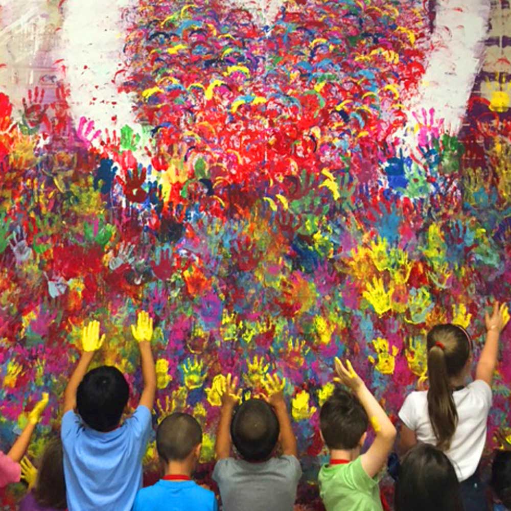 You have the entire studio for yourself on the day of the party and can bring in whatever food you’d like (most opt for pizza). Everyone, including the adults, creates a series of beautiful prints and you all get to work on our large canvas paintings throughout our 5,000sq/ft studio.