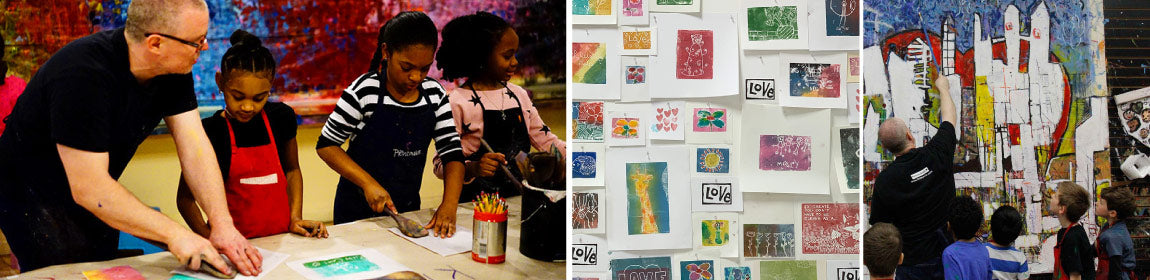 Book your trip with us today!Everyone including the teachers and parent chaperones will create their own set of beautiful prints (ink on paper), using our kid-friendly printing press. We’ll teach the tools and techniques and guide you all through the process. You’ll also get the chance to collaborate on or large canvas paintings and papiér-maché sculptures throughout the studio.