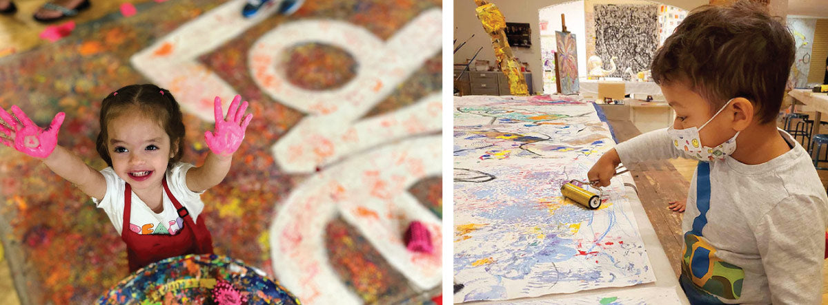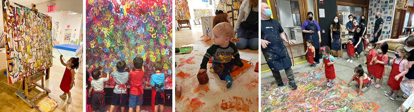 Our Toddler Workshops are 90 minutes of high-energy art activities where you & your child will create a set of beautiful prints and have the opportunity to work on our large paintings & papiér-maché sculptures in a 5,000 sq/ft studio.