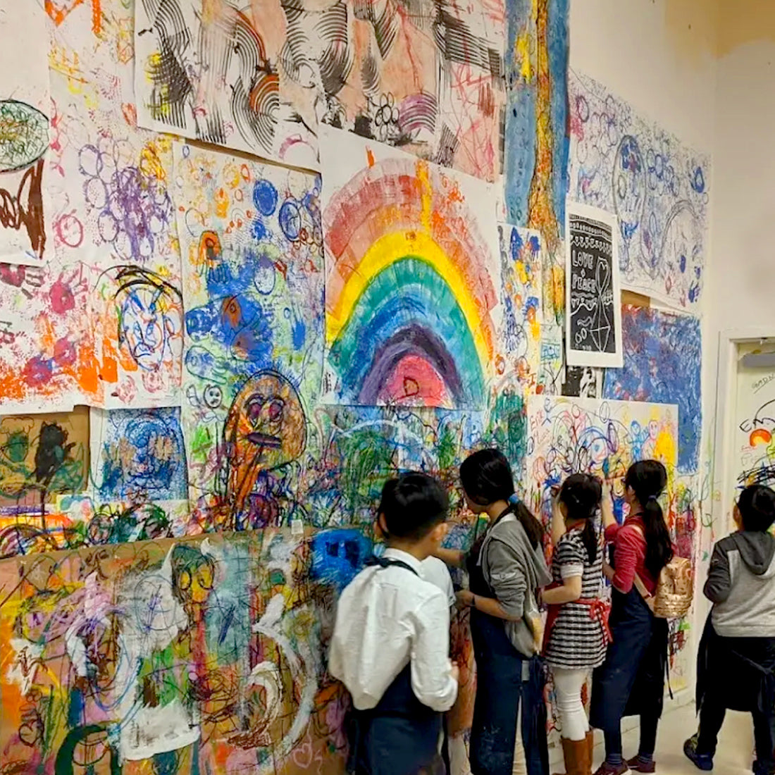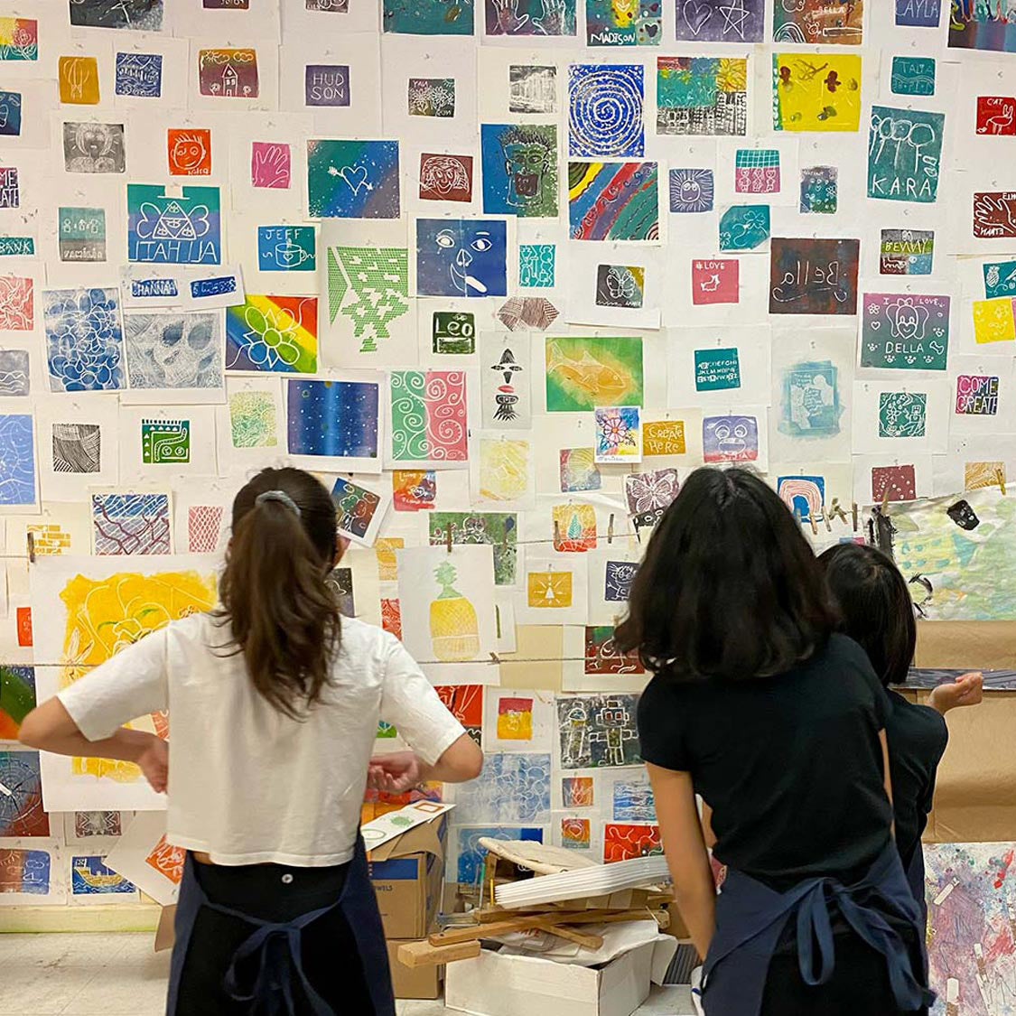 Our team guides you through the tools & techniques (no experience necessary). You’ll both create a series of beautiful prints, using our kid-friendly printing press -and- work on large collaborative paintings & papiér-maché sculptures throughout our new studio on the other side of Atlas Park.