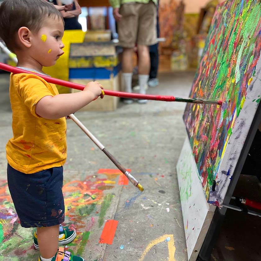 Our workshops are high-energy, super messy and also include working on our large-scale collaborative art paintings and mixed-media pieces in our incredible 5,000 sq/ft shop!