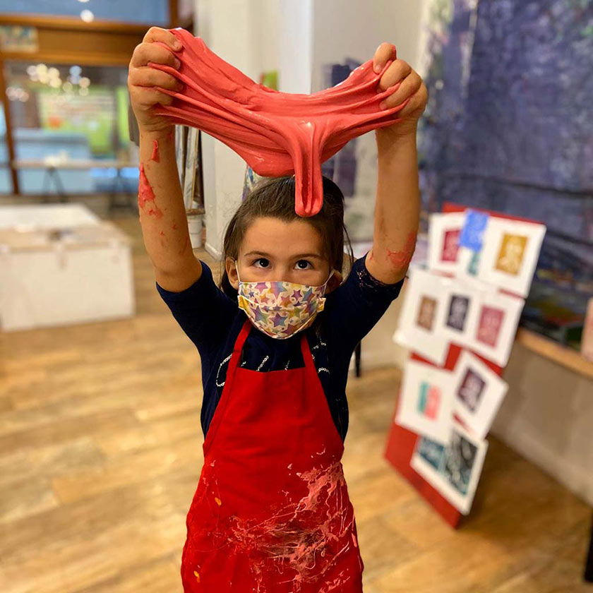 Your child will make giant globs of slime and we’ll make bubbles and other fun stuff. Then we’ll all create some beautiful prints and work on our large collaborative paintings (only the kids make their own slime, but you will make some really cool art too!).